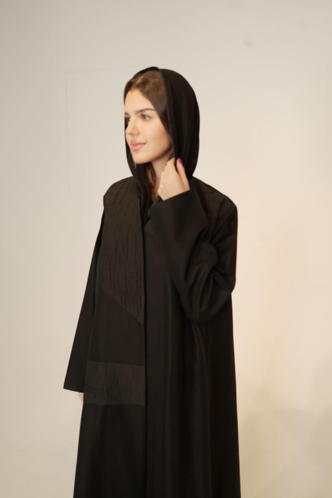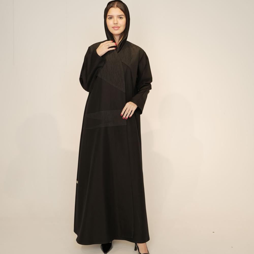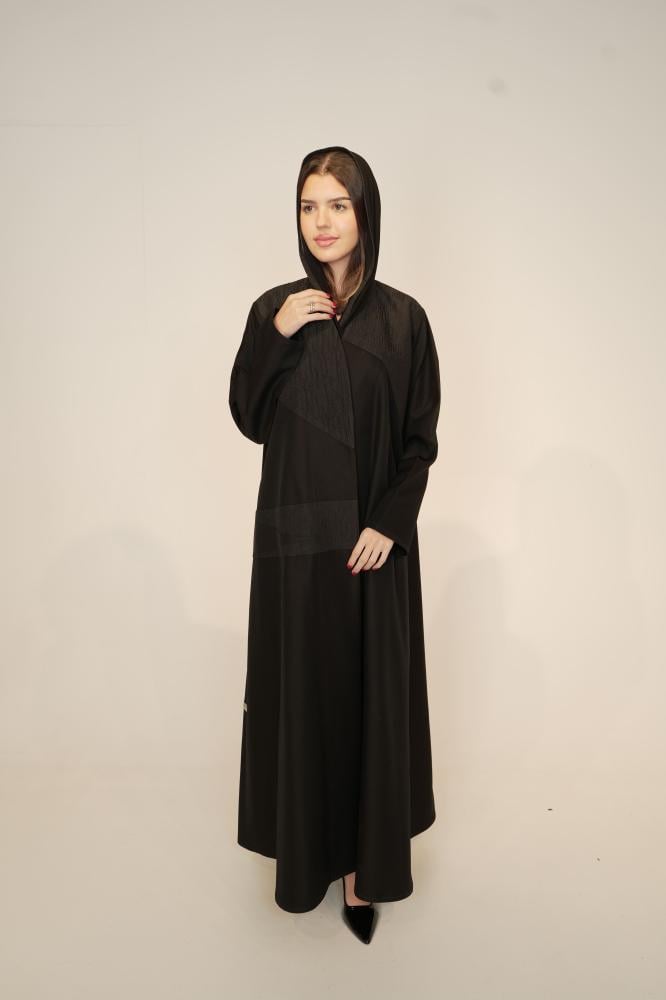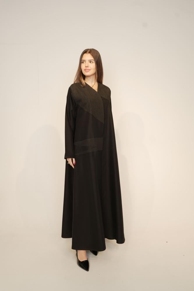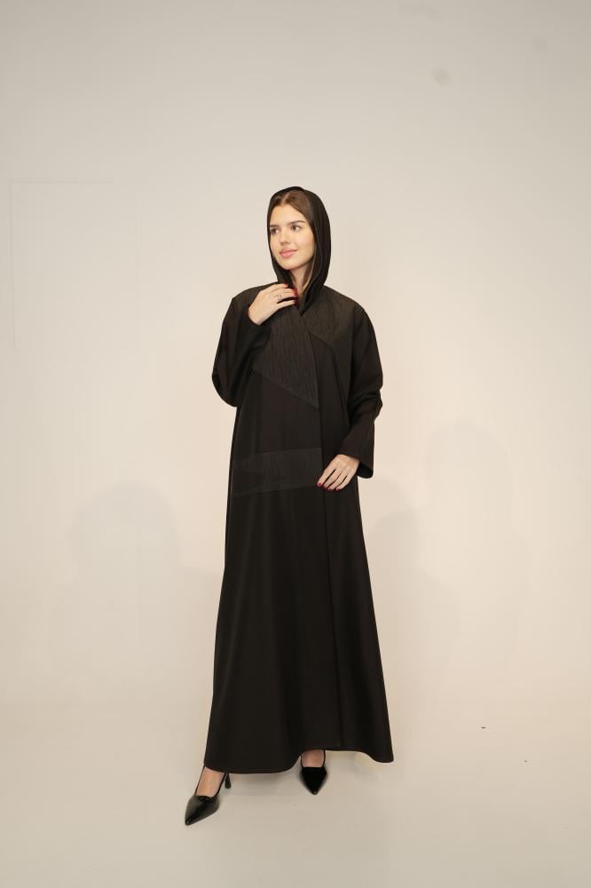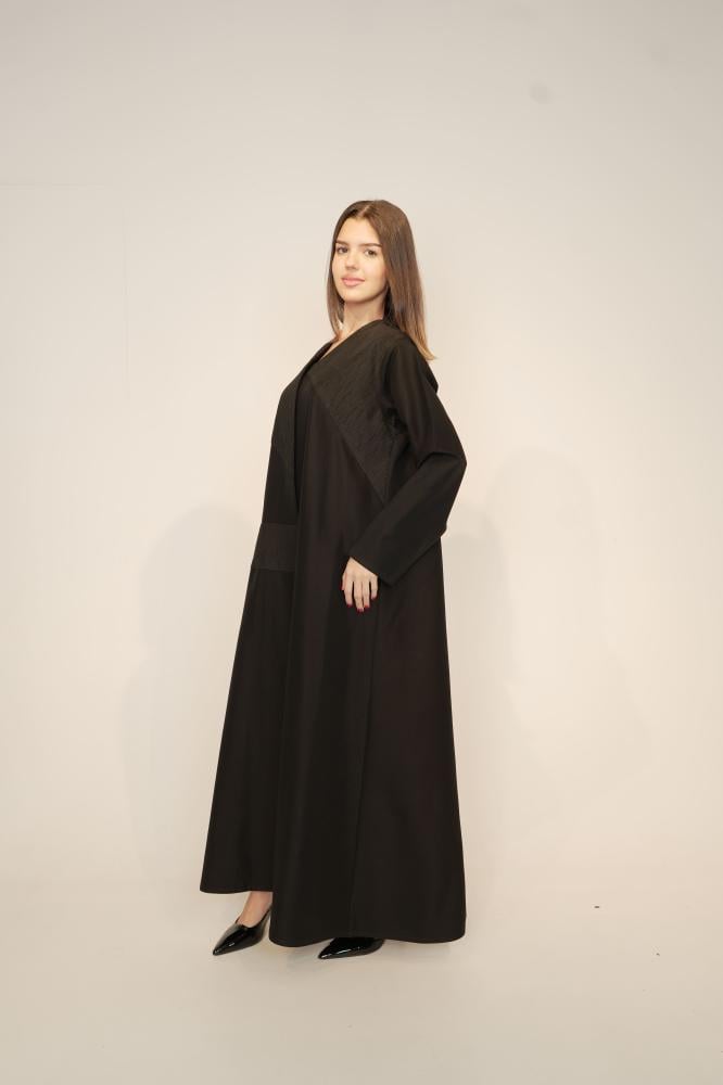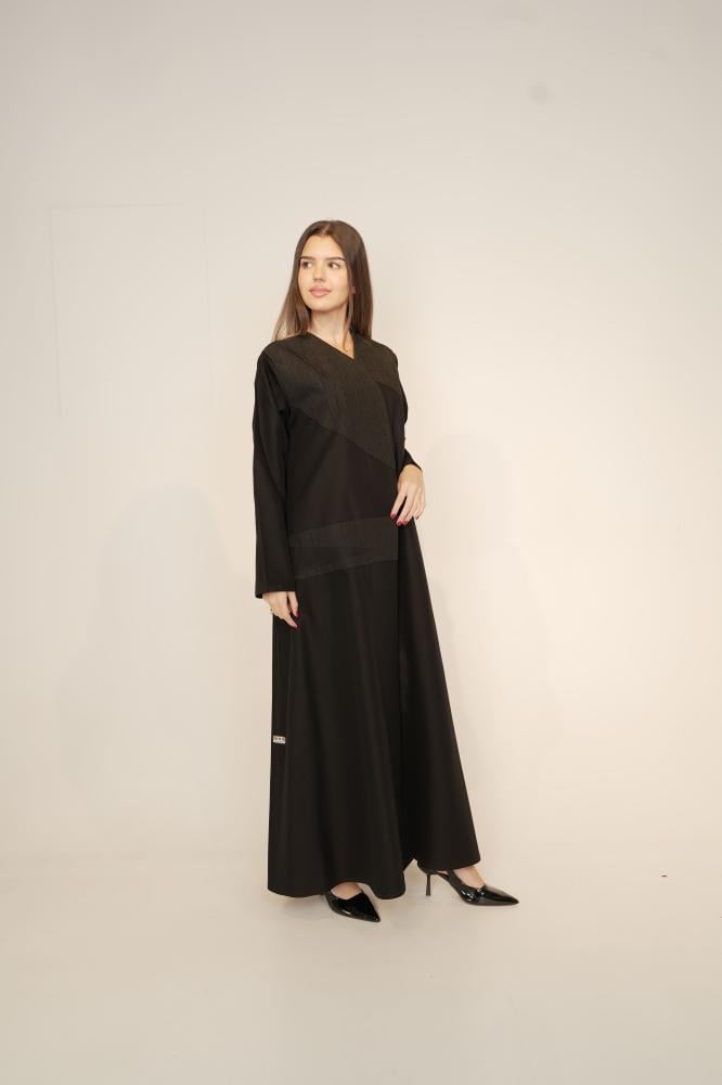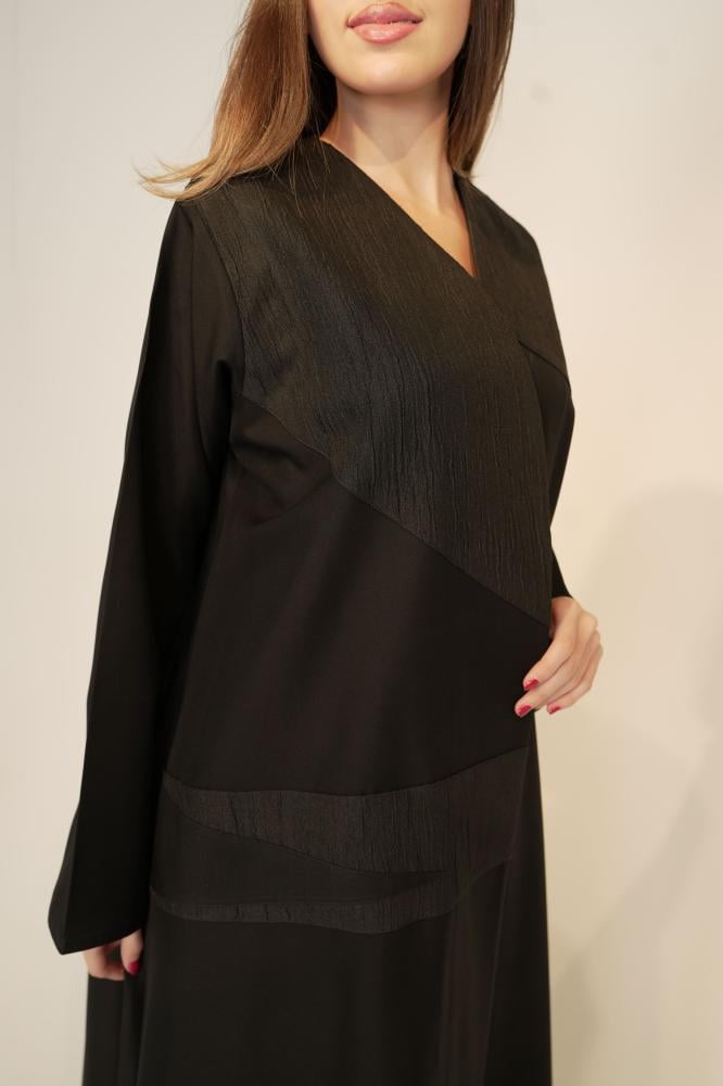عباية بقماش كتان اسود مع قماش مكرمش بتصميم انيق