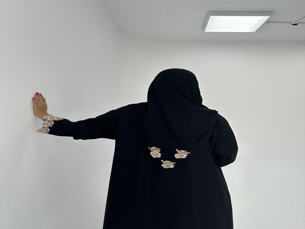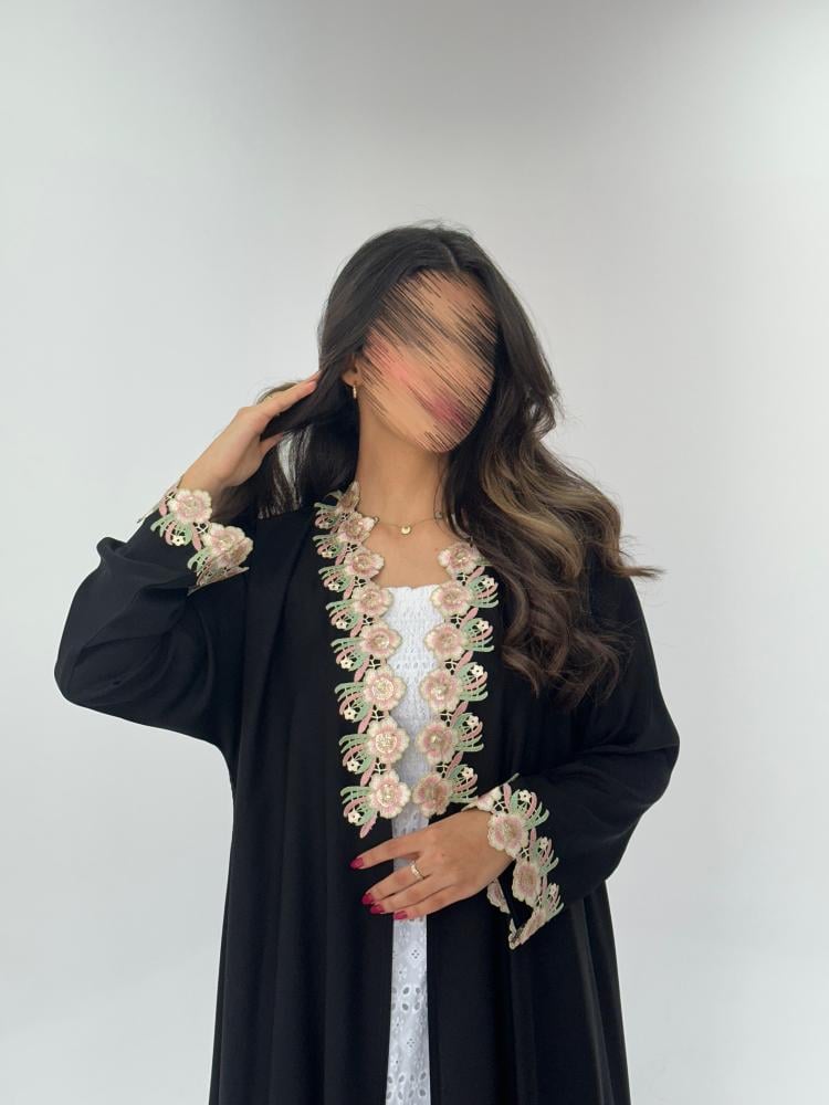 عباية بقماش ندى مع ورد في الكم وبداية العباية
