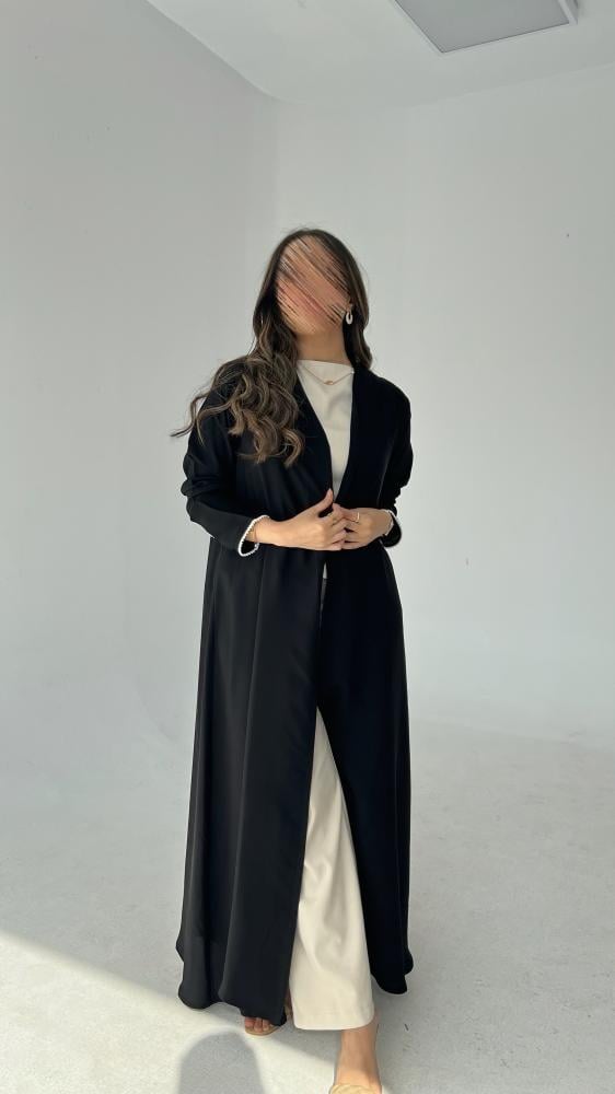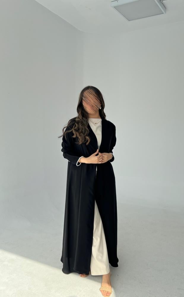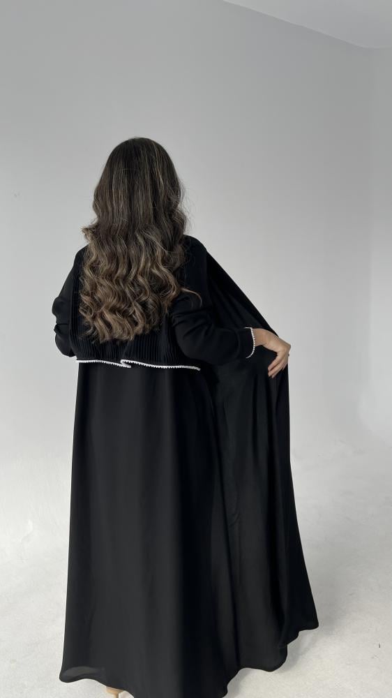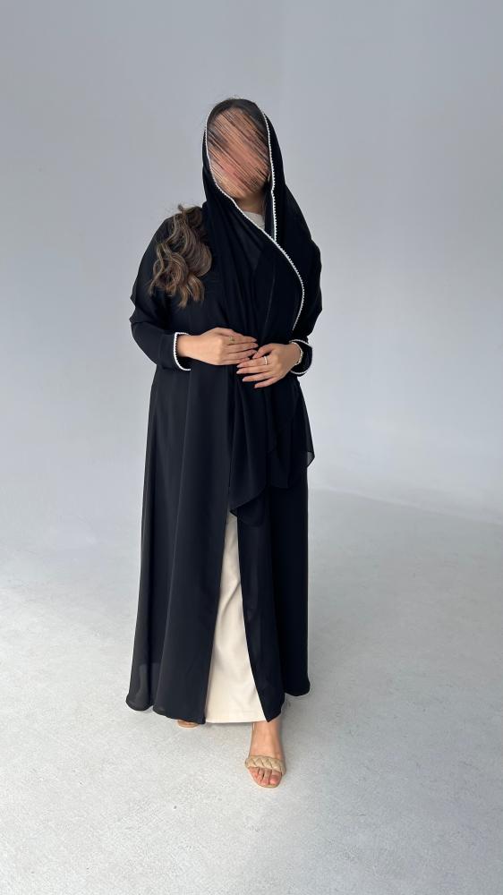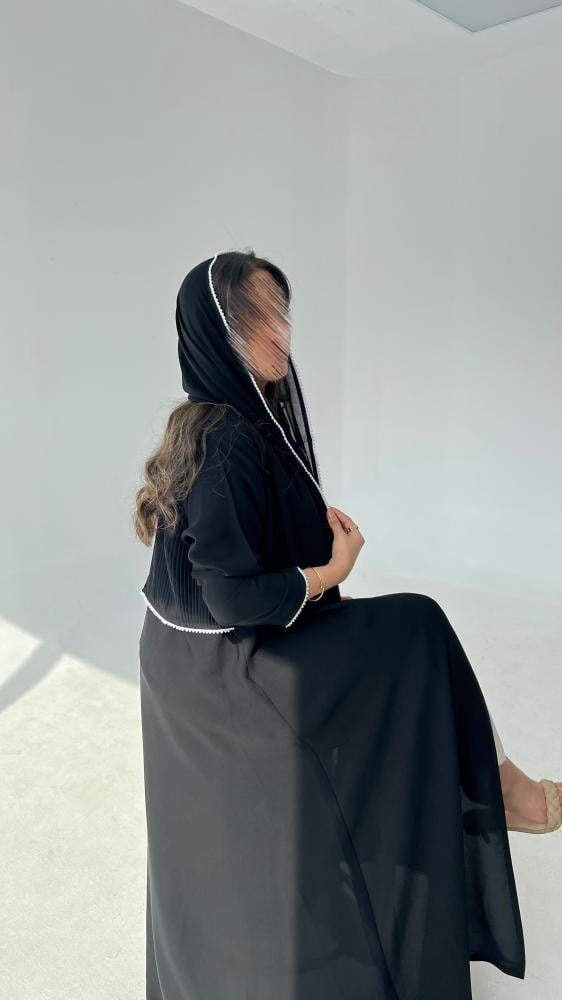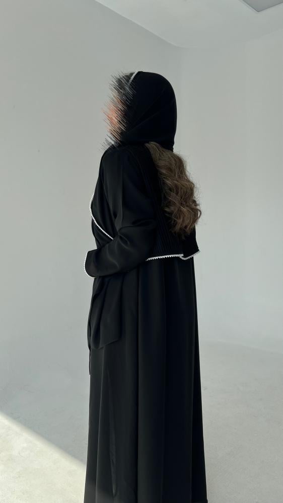 عباية سوداء بقماش الانترنت مع لولو وكسرات من الخلف وطرحة سوداء بطرف