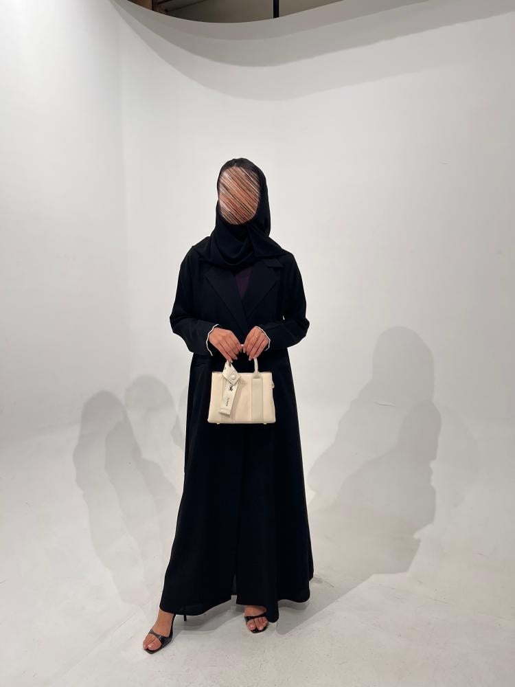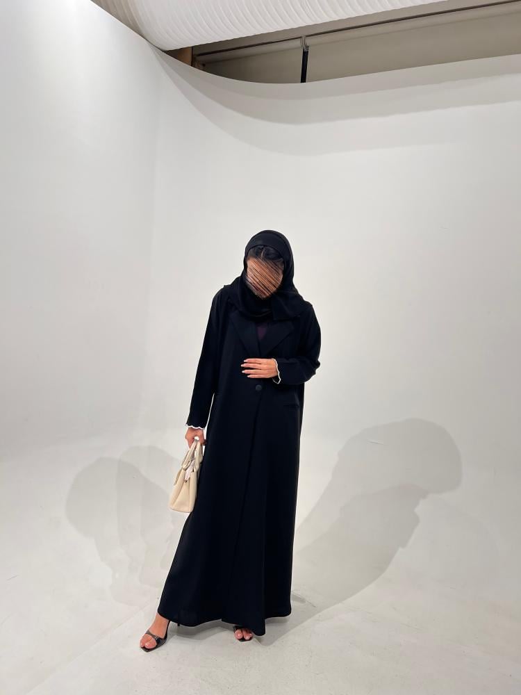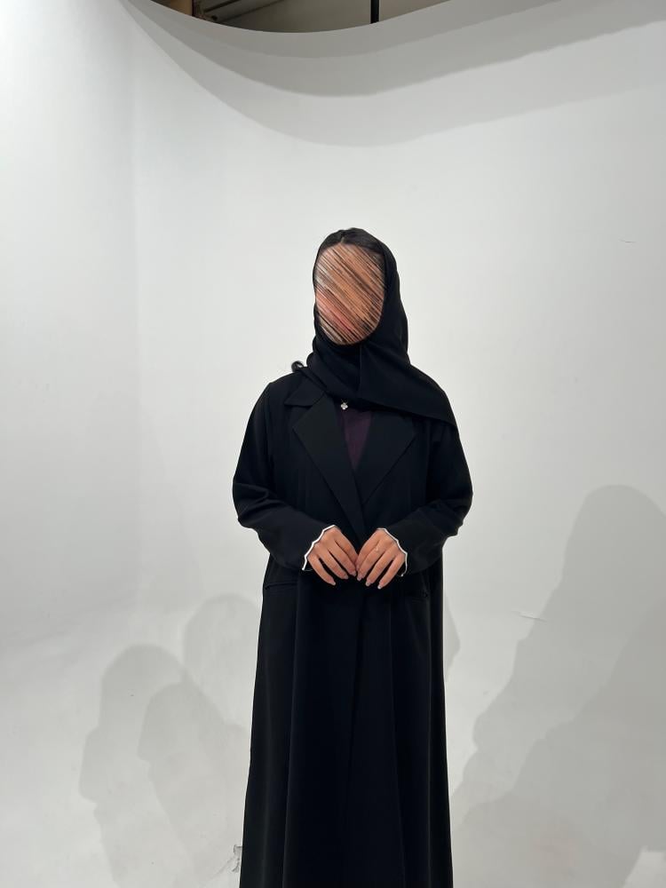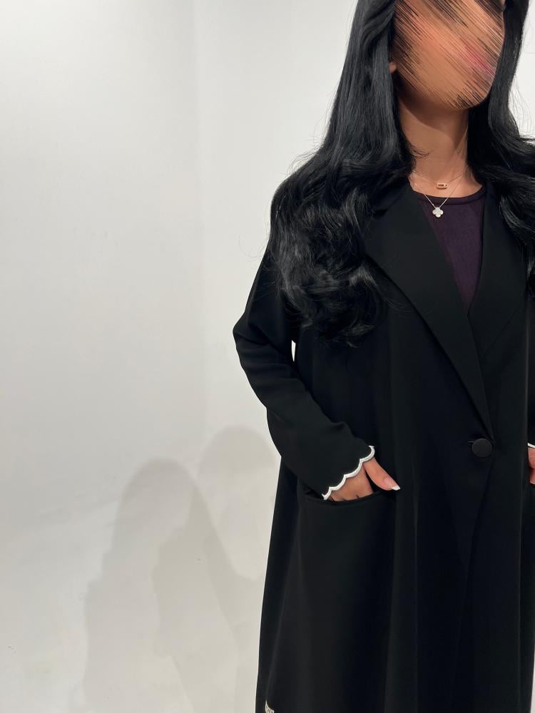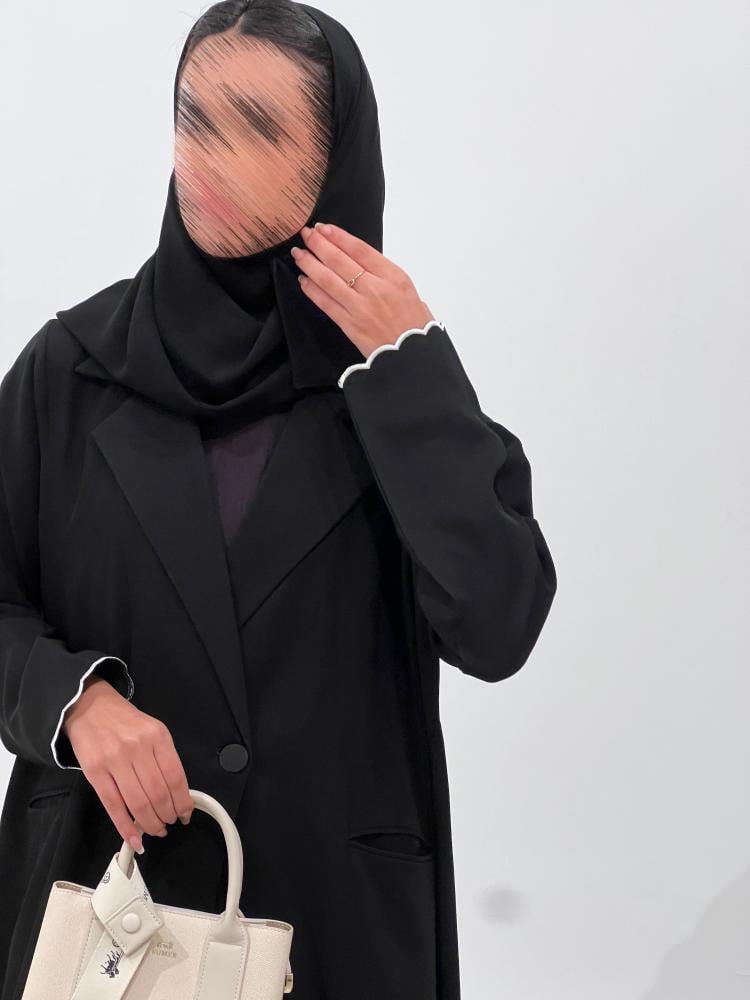 عباية بليزر كريب سراميك اسود مع تطريز ابيض طرف الكم