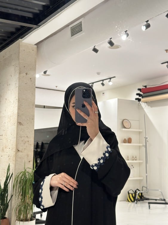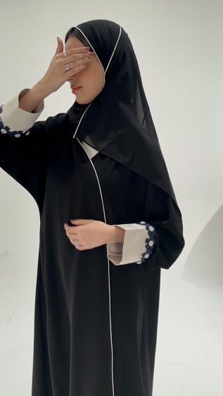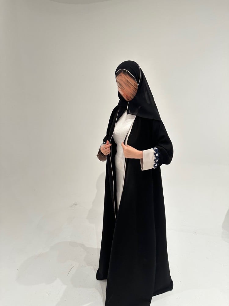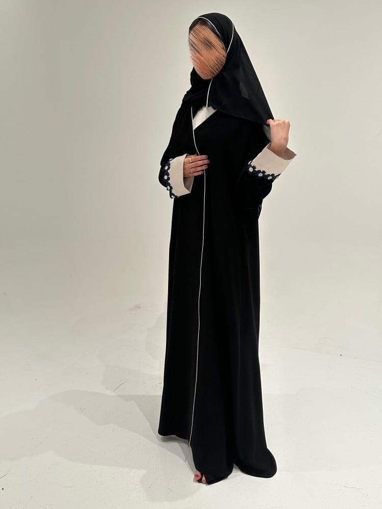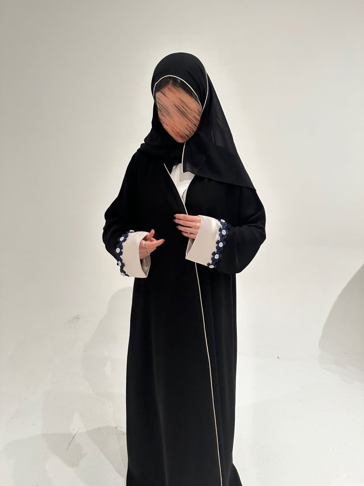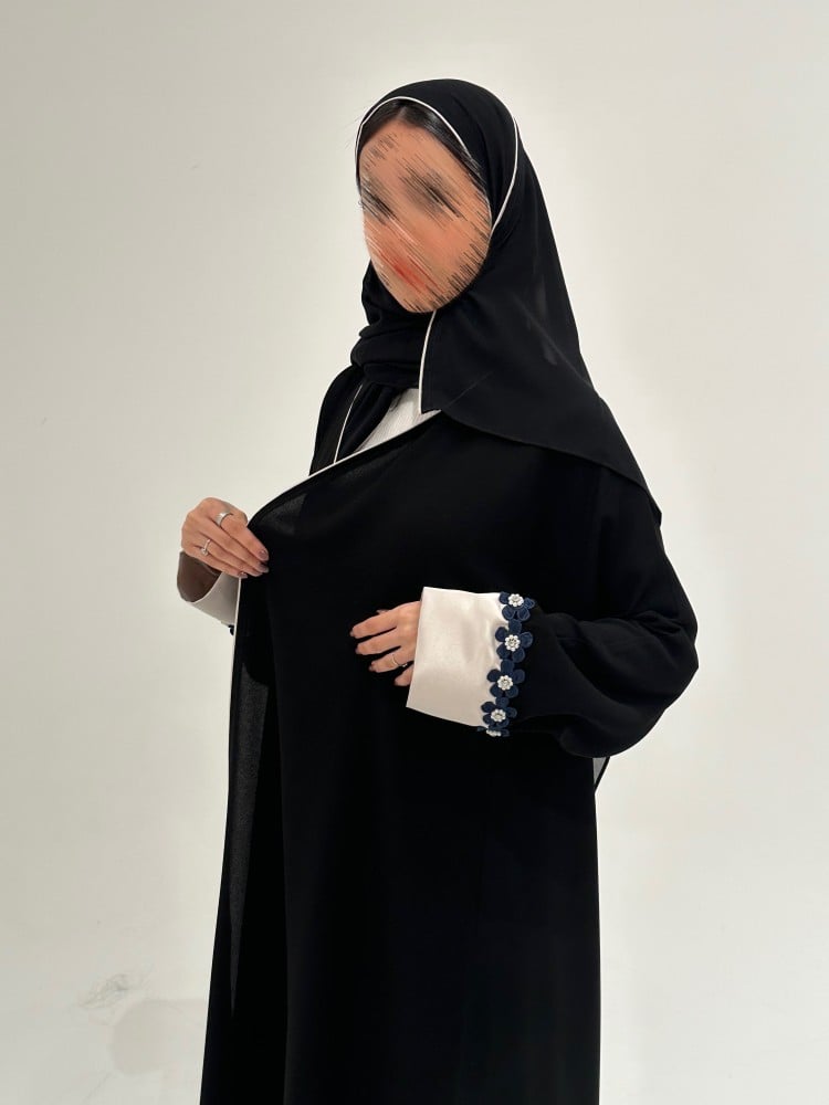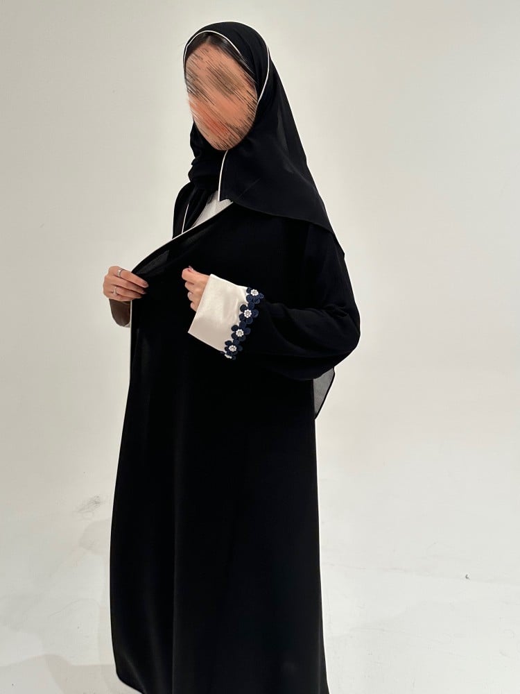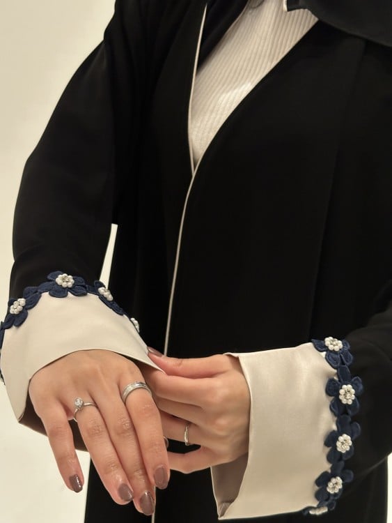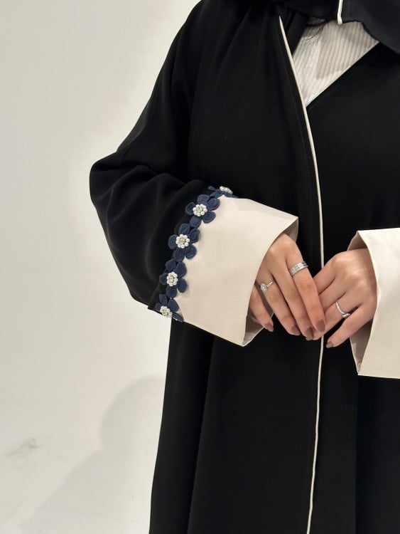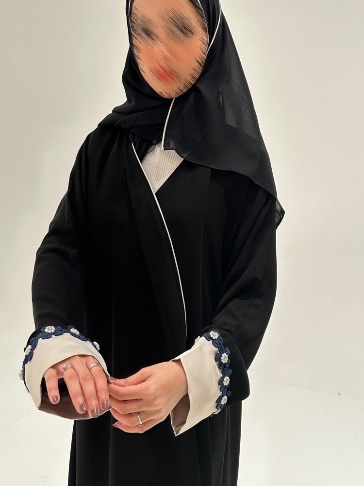 : عباية سوداء بقماش الكريب الملكي مع تفتة بيج في الكم و ورد ازرق
